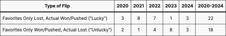 Instead, I am just as, if not more, interested in who “should” have won the game. Using the spreads provided by the sportsbooks as a proxy as who “should” have won each game, I created a version of the seasons where every game resulted in the Favorite winning. These Favorite Only versions, along with the Actual versions for each season can be found above. The difference between these two versions provides an opportunity to assess how “lucky” the model is. The charts below show this luck through the first 5 seasons. More about Upset Luck can be found here.