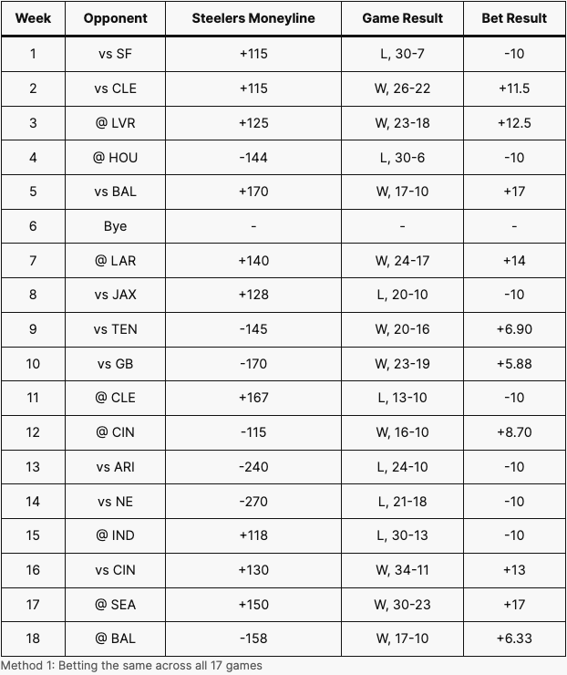 - Person B could bet a fixed amount that the Steelers win every game. Remember that over time, Moneyline will equal the Spread in terms of value, so one could also bet the Steelers to cover the Spread instead. Although this method is the same amount every bet, the bettor is still risking value each of the 17 weeks against the sportsbook unlike Person A who is competing against the sportsbook a single time.