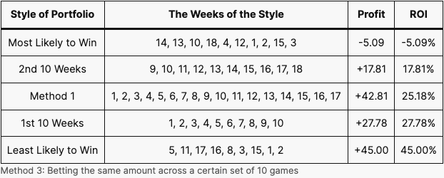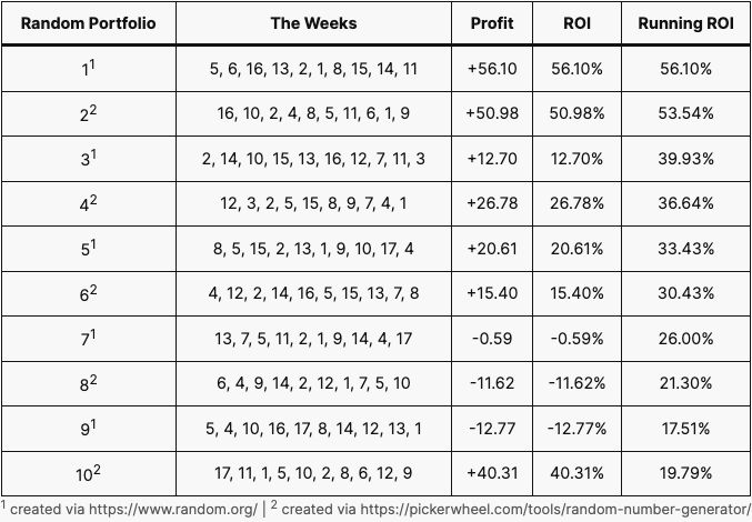 In order to show proof of the claim above, I decided to use a random number generator to see what the results of a portfolio of random Weeks from above would have been. The table below has the results of 10 randomly generated portfolios. As stated above, 2 of the random portfolios generate a higher ROI (and a larger profit) than any of the portfolios in the table above. However, 2 of them generate a lower ROI (and a larger loss) than any of those above as well. If the number of random portfolios goes to infinity, then the average ROI would approach the ROI of Method 1.